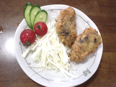 牡蠣フライ作ってみました。材料は、豆腐・青海苔・海苔の佃煮・スライスチーズ・焼き海苔です。 (牡蠣のような色の材料です)食べたとき首をかしげる様子、私も一口食べてみると・・・みんな無表情でした。久しぶりに食べる牡蠣フライ、せっかく楽しみにしていましたが、味はいまいちでした。(作り方が悪かったのか?分量は指示どうりにしたんだけどな・・・)「もう一度食べたいと思わない」と言われました。m_mそれよりキャベツの千切りふとーい^^気にしない。