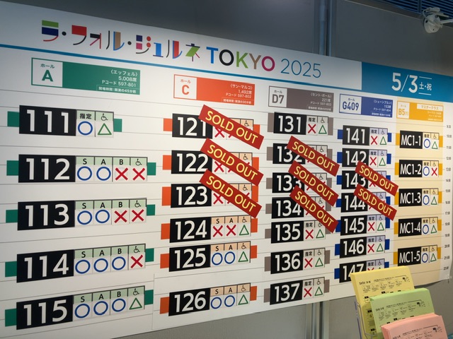 ちょっと見難いですが、10:40現在の残席状況。小ホールで残ってるように見えるのは、車椅子席があるからです。実質完売。ホールAと一部のC、マスタークラスくらいですかね…