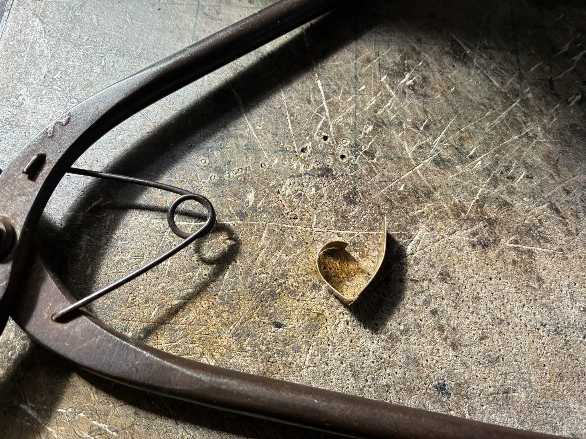 真鍮板を使って水筒を作ります。金切りばさみで切り出した真鍮板を、少しづつハートの形…