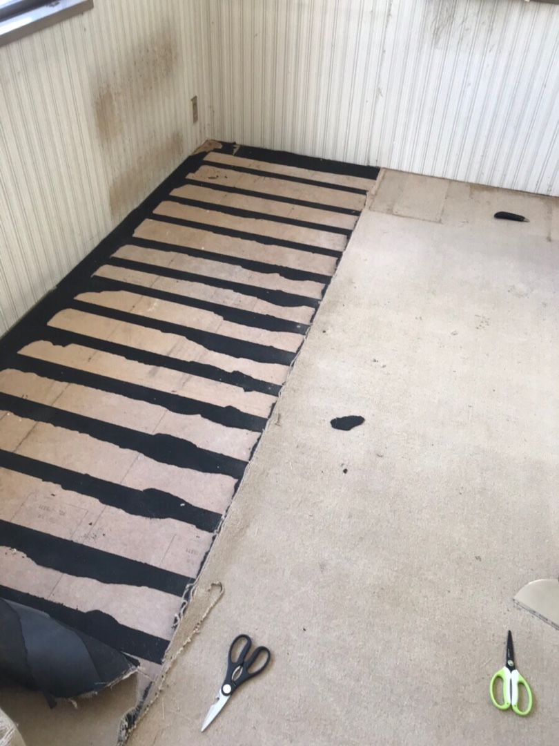 お次はカーペットからCFへの貼り替えです。テープが強力で剥がすのに気合が要ります!池田の山々に絶叫がこだまする〜!