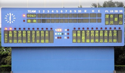 イースタンリーグ公式戦湘南・ヤクルト11回戦 ヤクルト6勝5敗ヤクルト 6 = 001 230 000横 浜 8 = 010 025 00X【バッテリー】 (ヤ)木田・上原・高井・西崎・花田―川本 (湘)吉川・高宮・牛田・高崎・山口―新沼【責任投手】 (勝)牛田(8試合、2勝1敗) (S)山口(26試合、3勝2敗1S) (敗)上原(24試合、3勝1敗2S)【本塁打】なし7月9日以来、横須賀へ! 一軍の公式戦はオールスター休みに入り、試合再開は8月3日。横浜のこれまでの成績は30勝61敗借金31。もう取り返しのできない数字。昨年の今頃は41勝36敗1分け、貯金5の3位で前半戦を折り返している。去年と比べると雲泥の差。巨人ファンの友人から横浜は野球が下手だ、采配が下手だ、と言われても返す言葉もない。仕方あるまいこの成績では・・・ で、弟分の湘南はどうなんだろうと目を向ける。このところ連敗しているので心配だったが一応ヤクルト、巨人に次いで3位につけている。7/29現在で34勝30敗、貯金も4つある。昨日、一昨日とヤクルトに2連敗、今日は何としても勝ってもらいたい。ということで7月9日の日ハム戦以来の横須賀スタジアム観戦となりました。二軍観戦もまた楽し・・・両軍の先発オーダー吉川、高宮、ピリッとせず 先発吉川は1.2回は3人ずつ抑え、無難なスタートだったが3回バックの守備の乱れから梶本、上田に連打を浴び1点を失うと4回、一死後ガイエル以下に4連打、2点を失い降板。その後受けた高宮も5回に先頭打者上田以下に4連打を浴び、結局この回5安打3失点。 吉川は04年ドラフトの自由獲得枠で入団5年目、高宮は同じく06年希望枠で入団3年目。互いに期待はされたが、一軍では結果を出していない。この日のピッチングを見ても意気が感じられず不甲斐無い。二人とも正念場を迎えている、いつまでも二軍の水にどっぷり浸かっている訳にはいかないだろうに・・・打戦が盛り返す 5回表終了時点で1-6と劣勢、このままズルズルと行ってしまうのかと思っていたが、5回.6回と打線が爆発。特に6回は先頭の内藤がヒットで出塁すると一死後に新沼、高森、代打鈴木尚典が3連打、満塁とし河野の走者一掃の3塁打。さらに梶谷がスクイズを決めるなど、鮮やかな逆転劇。堂々のマウンド、山口俊投手 そして最終回の締めは山口俊。私のお気に入りの投手だ! 山口は先頭打者4番牧谷を見逃し三振、ガイエルにはヒットを許すが、ユウイチを空振り三振に、川本はライトファールフライに打ち取る堂々のマウンド。早く一軍で彼のピッチングをみたいのだが、お声は掛からない大矢監督は見ているのだろうか?湘南田代監督も何故一軍へ推薦しないのか?山口のピッチングを見るたび思う。速球が冴える、クローザー山口俊ヒーローインタビューを受ける逆転の三塁打河野選手と、勝利投手の牛田投手【ひとこと】 折しもこの夜は、私の地元(逗子)では花火大会。ある企業が大スポンサーになり年々派手になる花火大会だが、その見物を回避して見に来たかいがあった。8-6で湘南逆転勝利、対ヤクルト3連敗阻止し、貯金も5に・・・気持ちよく帰途につきました。