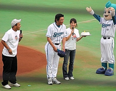 イースタンリーグ公式戦 湘南・日ハム12回戦 湘南8勝4敗 日ハム 2 = 010 001 000 湘 南 3 = 201 000 00X 【バッテリー】 (日)吉川・山本・菊池―渡部 (横)阿斗里・岡本・山口俊・マットホワイト―斉藤俊 【責任投手】 (勝)阿斗里(9試合、1勝2敗) (S)マットホワイト(3試合、1S) (敗)吉川(8試合、3勝3敗) 【本塁打】 (日)なし (横)呉本2ラン(1回、吉川) 田代監督の誕生日 7月9日、田代監督の誕生日。試合前オフィシャルリポーターの吉岡さちこさん手づくりのバースデー・ケーキのプレゼントがあり、田代監督は照れながらケチャップさんのインタビューに応じていました。大洋時代、和製大砲の「オバQ」さんも54歳。 昔大洋の打者はホームランを打った数だけ、☆(星)のシールをヘルメットに貼り付けていました。田代監督現役時代、沢山の星のシールを付けたメットを被り、高く滞空時間の長い放物線を描き、スタンドへ放りこむ豪快なホームランは今でも忘れられない。 そんなこんなで試合開始前は和やかなムード・・・ 誕生日のケーキ・プレゼントに照れる田代監督 両軍の先発オーダー阿斗里好投、今季初勝利! 湘南先発は阿斗里投手は初回、日ハム俊足の村田にいきなりヒットを浴びる、そして盗塁を企てられるが、斉藤俊がこれを強肩で刺し、3人で切り抜ける。すると2回、二死からヒットの内藤を1塁に置いて、呉本がレフト芝生席へ2ランを放ち阿斗里を援護。結局阿斗里は6回を投げ打者23人に対し、被安打6、奪三振5、失点2、自責点1(1点は捕逸によるもの)と好投、今季初勝利を挙げました。一方日ハムの先発吉川も6回を投げ被安打6、奪三振7、自責点は呉本のホームランによる2点だけとこちらもナイスピッチングでした。山口俊、好リリーフ 7回、阿斗里の後を岡本が投げたが先頭打者市川に2塁打を浴び、即、山口俊にスイッチ。そしてここでも斉藤俊に強肩が冴える。離塁がやや大きい市川を見て2塁に送球、牽制で刺すと、その後は山口が好投。7・8回の2イニングを四球を一つ出すものの、あとのアウトはすべて三振に取る5奪三振。速球が冴え、横須賀スタジアムは球速は表示されないが、多分150キロ近く出ていたのでは??? 本人もヒーローインタビューで、早く一軍で貢献したいと言っていたが、何故一軍に上げないのか不思議です。 先発で好投、阿斗里投手 2イニング5奪三振、好リリーフの山口俊投手 ヒーローインタビューを受ける左から呉本、山口、阿斗里の3選手【ひとこと】 この試合スコアブックを持参。そしてラジオではイヤホーンでヤクルト・横浜戦を聞きながらそちらの試合のスコアも付けながら忙しい観戦。湘南・日ハム戦は投手戦ということもあったが、試合時間は2時間半強。攻守交代も早く駆け足で…特に日ハム選手は交代するときは全力疾走、観ていて気持ちが良かった。 そんなわけでヤクルト・横浜戦のスコアも7回まで付け、その後の試合模様は横須賀スタジアムからカーラジオを聞きながら帰宅、丁度家に着いた頃、試合終了と相成りました。 ヤクルト・横浜戦は両軍合わせて21安打の乱打戦。初回金城、村田のホームランなどで5点を取っても一時は追いつかれ、楽勝とはいかなかったが、ビグビー、ジェイジェイの活躍などで何とか勝ち、やっと助っ人が遅まきながら揃い踏みとなったようです。 ジェイジェイの『ファームで多く打席に立てて、日本人投手にも慣れた。湘南のみんなに感謝している』のコメント、泣かせるね。