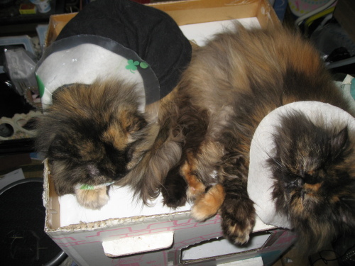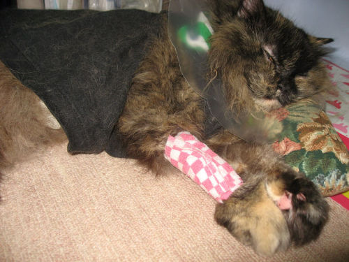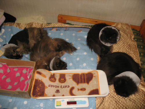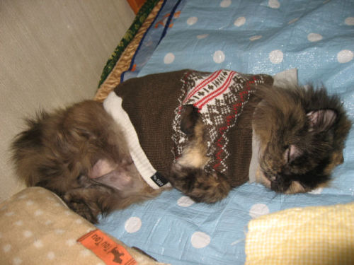 今朝、ベッドから降りるとカーペットに点々と鮮血が。え!!誰???一番考えられるのは、手術をしたばかりのララちゃん。でも、喉に傷から血は出ていない。ならば、”誰かが足に怪我をしたのでは?”と見回したけれど、足をひきずっている猫も居ない?でも、やはりララちゃんが可笑しい。動かない。。。取り合えずご飯を出してあげて、様子を見たら動いたララちゃんの場所に鮮血が。”何処で、足傷つけたのかなぁー”と思いつつ、しばらく様子を見ていた。朝の掃除も終わって、傷の手当をしてあげようと、用意をして抱っこしたら足には傷が無い?え???何処なの???色々捜したら、なんと肛門から出ているみたい。直腸がん???まさか???でも肺に影が有ったし。。。慌てて長ピーDRにをかけてみたら、取りあえず昼まで様子を見るように言われた。その様子で、来れるならに来るようにとの事だった。昼になって、様子をみたら鮮血は止まっていたので、”行かなくても良いかなぁー”と思いつつ、悩んでいたら(遠いからね)ハリケーン麻ちゃんから。急遽、タッ君パパさんが連れて行ってくれることに。そして先ほど帰ってきました。原因は肛門腺が中で破裂していました。早く連れて行って良かった。そのまま血が止まったからって放置していたら、命取りでした。本当、タッ君パパに感謝です。家に帰ってきて、熟睡しているララちゃん。
