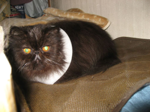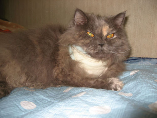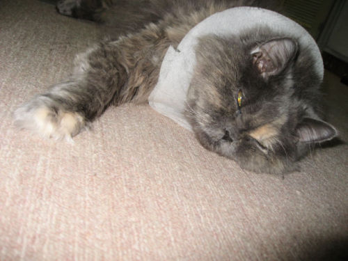 首の周りの包帯が痛々しいですが、ちゃんと昨日からフード食べてくれるので、ホッとしています。でも、怖い顔している。。。。。