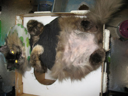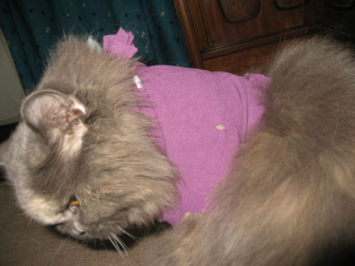包帯を交換してあげました。タイツのお尻の部分を利用して、作ってあげました。少し楽に成ったのか、伸び伸びしています。