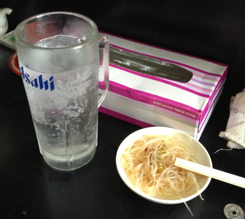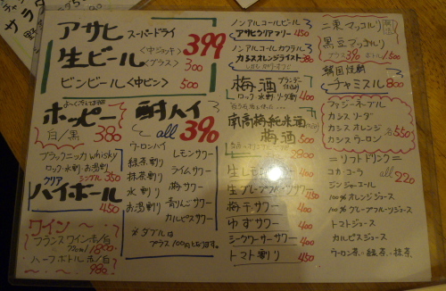 先日酔った勢いで、伊勢佐木町に出張してきた。いつもの呑兵衛仲間との飲み会である。最近の居酒屋さんは過当競争時代に突入し、昔のピンサロの呼び込みのように店員を街頭に立たせている店が多い。店の宣伝にはなるが、飲み屋は酒とアテ・値段・居心地の勝負である。これらのどれが欠けてもいけないが、どれかが突出していれば妥協する場合も多い。今回のお店は店頭に並べてあるトロ箱のお魚と、店員の呼び込みに誘惑されて入ったお店である。まずはお酒のメニュー。生ビールが安いので、確か生ビールを頼んだ気がするが覚えていない。びっくりするのはチャミスルの値段である。あんな旨くもない酒がなんと800円もする。こんなの飲む人がいるのだろうかと心配してしまう。 笑ったのは、このおしぼり。見て分かる通り、くっきりと口紅が付いている。このあたりは曙町が近いので、ちょっと引いてしまうおしぼりである。男性の皆さん、気持ちよさそうにおしぼりで顔を拭いている人が一杯いますが、気を付けた方が良いですよ。刺盛(値段は忘れたが、3000円くらいであったろうか?)。見た目にかなり豪華である。この日はサザエの良いのがあるという事で、サザエも盛ってもらった。後ろから見ると、スズキとホウボウの尾頭が恨めしそうに鎮座している。多分使いまわしだとは思うのだが...刺身の内容は写真を見ていただければわかるが、8種類くらいの魚が盛りつけられている。これで3000円程度であればコストパフォーマンスは高い。ただ食べてみると、あまりいい包丁仕事をしていないことがわかった。見栄えが良いだけに少々残念である。人間の口の中の感覚は、身体の他の部分と比べて極端に敏感なのである。刺身に関して言えば、同じ魚でも切れない包丁で切った刺身と研ぎ澄まされた包丁で切った刺身では全然味が違ってくる。味というより、舌触りなのだろう。まあ酔っ払っているので、そんなに気になる程でもないのだが、これが1軒目だったらかなりがっかりしたことだろう。サザエの肝。なんという毒々しい緑色だろう。まるで抹茶ゼリーのようである。でも、貝好きな私は真っ先にこれを頂いてしまった。一番好きなのは鮑の肝である...デジカメに残っていたのはこれらの写真しかない。この後、中村町三吉橋通にある「三吉橋フライ屋」まで行ってしまった。多分4軒か5軒くらいハシゴしたのだろう。「三吉橋フライ屋」では、レバ刺しやつぶ貝を食べ、愛想の良い若い店主と話したことくらいしか覚えていない。写真もろくなのがなかったので、紹介するのはまたの機会にする。