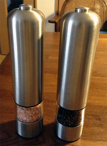 先日楽天で、電動ミルを購入した。 久しぶりにショッピングネタである。左が岩塩、右がブラックペッパーを入れた電動ミル。今まで市販の食塩やブラックペッパーを使っていたのだが、市販の食塩ではミネラル分が塩化ナトリウムのみで、健康を考えるとミネラルをタップリ含んだ岩塩を使ったほうがいいということがある本に書いてあったので、それならばとミル、岩塩(ミル用)、ブラックペッパー(ホール)を購入したのだ。電動ミルにしたのは、価格が安いのと使うときに片手で済むという理由から。この電動ミルは下の部分に豆球が付いていて、挽きの粗さも調整できる。最初は豆球などいらないだろうと思っていたのだが、キッチンやダイニングは結構暗目の照明を使っている場合があるのでかなり便利である。ウンチクは下記商品ページを見てもらえば分かるので割愛するが、単3電池を4本も使うのでガタイはでかい。でも片手スイッチを押すだけという簡単さから、ちょっと料理に塩を足したりだとか胡椒をかけたいときに、気軽に使うことができる。本体から取り外したケース部分。本体の大きさから比べて容量は少ないのだが、ペッパーなら30gくらいは十分入る。相当頻繁に使う家庭でなければ、2週間は持つだろう。ただ入口が小さいので、こぼさずに塩や故障を入れるのが難しいが、ケース周りを手で囲うとか、電池抑えのカバーをかぶせるとかすればこぼさずに補充できる。コーヒーでも同じなのだが、最初から挽いてあるとすぐに酸化してしまうので、食べる直前に挽くのが香りや味が一番である。塩むすびも旨かったが、岩塩のまろやかな味は市販の食塩では絶対に出ない味である。要するにとんがった塩辛さではないのだ。いつもは茹でたアスパラにはマヨネーズが欠かせなかったが、このヒマラヤ岩塩をかけるとマヨネーズなどいらなくなってしまう。旨い肉に味付けは塩コショウのみとよく言われるが、挽きたての塩コショウがあれば確かにそうであることが分かる。電池は付属しないので、こちらも楽天からエネループより優れ物で値段も安いエネロングを購入すればよい。こちらは2本以上で送料無料、しかも7本購入すれば1本サービスになるので、ちょうど電動ミル2本分として使うことができる。毎日の料理が楽しみだ。【5月分完売御礼!】[卓上用品/ペッパーミル・ソルトミル・シェーカー]ペッパーミル 2個セット/...価格:1,980円(税込、送料別)☆世界1の風味の粒コショウ☆食べる直前にペッパーミルでガリガリ!アンコールペッパー 50g ×2...価格:1,000円(税込、送料別)ヒマラヤ岩塩ピンク(食塩) 食用塩公正マーク付 3−7mmの粒 ミル用1kg メール便食用ヒマラヤ...価格:997円(税込、送料別)楽天最安値挑戦!1本 enelong 単三電池 電池 enelong 単3 約1000回繰り返し使用可能!eneloo...価格:181円(税込、送料込)