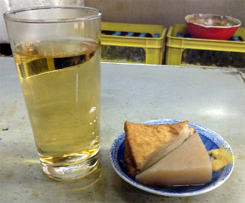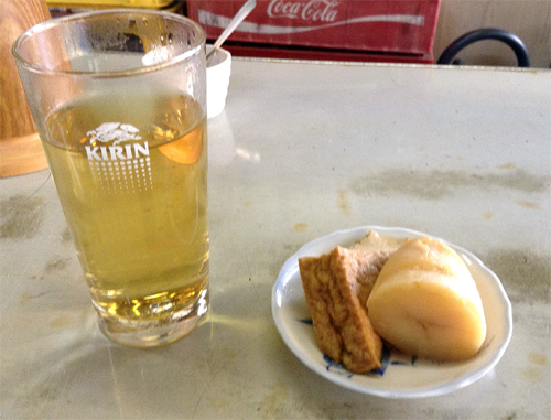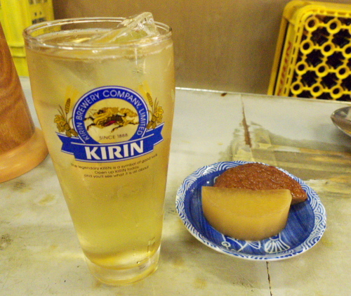 昨日、夜勤明けで昼から飲んだ。最近ご無沙汰していたので、まずは「みのかん」へ向かう。暑かったので、さすがにハイボール。この日のおでんは、大根とがんも。大根は味がバッチリしみていてウマウマ。お客さんは先客が1名のみだった。新聞を読みながら一杯やっている。夜勤明けでマッタリと過ごすには最高のシチュエイションである。きんぴらごぼうとお新香。どちらも七味が欠かせない。私はお新香には醤油はかけない派である。せっかく漬かっているお新香に失礼だ。ごぼうが柔らかくて美味しかった。やはり旬のものは旨い。これだけのアテでハイボールを3杯やっつけて程よい気分。前日の夜勤では、かなり色々とあったので(肉体的にも精神的にも...)酒が良く効く。これでお会計は1,100円。さすがは「みのかん」。気分が良くなったところで、もう一軒行ってみよう。昼飲み鉄板コースといえば、関内の「かのや商店」しかない。焼酎とホッピー白・黒でハーフアンドハーフを楽しむ。焼酎とホッピーは冷えているのだが、ここんちはグラスが冷えていないので残念ながら氷は必要だ。この日のメニュー。いつもと変わらない鉄板メニューである。鶏唐とイカの塩辛をアテにした。暫く前に復活したおかあさんがフライヤーに入れっぱなしだったので、鶏唐は少々揚げ過ぎで固くなってしまっていた。こちらも〆て1,100円。偶然のなせる技かみのかんもかのや商店も1,100円だった。さすがにナカのお代わりは無し。もう既に疲れ切った体がベッドを要求している。家に帰った時間も分からず、気がついたらいつも通りソファーで寝ていた。しかも夜8時を回っている。気を失ったような爆睡だった。この歳になると、やはり夜勤はきつい。といっても、会社を辞めなければ夜勤も無くならないわけで、残念ながらヤクザな生活がまだまだ続くマグちゃんであった。