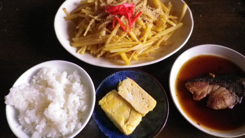 少しくらいええやろ…。少し離れた新築の家で、朝から何やらコンクリートをはつっているようで、ものすごい音がしてる。なので、ガラス戸を閉め切っていた。11時に原稿が入る筈が、なかなか入らないので、12時前に昼ご飯のおかずを作ろうと、ジャガイモの皮を剥いてるところへ、原稿が入った。天ぷらしてるとこやなくて良かった。そう言う場合か?説明を聞き終わったのが12時半を回って。ま、別に昼休みの時間とかは決まってへんけど…。こないだ、義姉のところで、ジャガイモをもらったので、短冊にして炒めた。これは子供の頃から好きなもの。母がよく作ってくれた。我が家のおふくろの味?味付けは醤油だけやけど。ごま油を軽くふって、ごまを摺りつぶし振りかけ、色づけに紅ショウガを乗せてみた。ジャガイモ二個分作った。好きなもんをいっぱい食べてみたい。これぞ、大人喰らい…。夏は、このジャガイモの炒めたんと、なすびの薄切りを炒めたんがあれば、言う事はない。今日の昼食。ジャガイモ短冊の炒め物、嫁はんが作っていった卵焼き、昨日の残り物のブリの照り焼き部屋をずっと閉め切ってたからか、昼から仕事してたら、なんや気分悪なって来た。ひょっとして熱中症?朝、しんどかったので、リゲイン飲んでみたんやけど…。頭ふらふらするので、少し横になった。水分補給せんと…。少し眠ったらましになったので、再び仕事にかかり、7時一旦終了。後は明日早く起きて涼しいうちに始めよう。