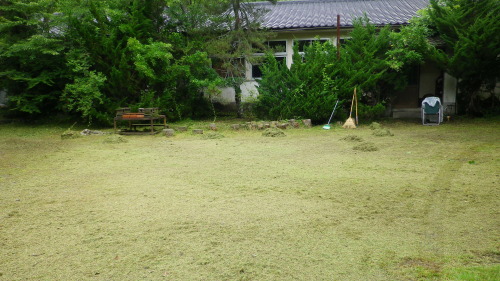 4時過ぎ、目が覚めた。6時に家を出るつもりやったけど、外見たら、雨降ってる。6時を回って嫁はんが起きて来たので、朝食を食べて。まったりしてたら、ついつい遅なってしもた。晴れるのが前提やったから、6時に家出て涼しいうちからやるつもりやったけど。7時過ぎ出発。途中、コンビニで栄養ドリンクを購入。結果飲めへんかったけど。8時には山の音楽舎に着いた。うっすら雨は降ってる。すぐに着替えて草刈り開始。刈り払い機に混合オイルを入れて。思い切り振った。いつもは、十回以上スターターの紐引っ張らんとかからへんけど、今日は、4、5回でかかった。前回、完全に燃料使い切って空にしてたからやろか?幸先のええスタート。しかし、草も地面も濡れてるので、泥が飛ぶ飛ぶ…。すぐに泥だらけ。3分の1くらい刈った時、いきなり後ろから肩叩かれた。誰やねん?て嫁はんしか居てへんねけど…。びっくりするがな。10時になったから休憩したら。て声かけたけど、聞こえてへんみたいやから。らしい。10時のチャイムが鳴ったらしい。エンジンの音が煩いから何も聞こえてへん。水分補給と持って来たあんぱんを食べた。少し休んで、再び草刈り開始。12時、半分くらい刈り終えて、昼ご飯を食べることにした。タッパに入れて持って来たご飯に、レトルトのカレーをかけて食べたけど。あんまり美味しない。朝、どこも開いてない思て、そないしてんけど。考えてみれば、コンビニ開いてるねん。コンビニで弁当買うて来たら良かった。思ても後の祭り…。一時間ほど休憩して。再び草刈り開始。ここからは、怒濤の勢いで一気に刈って行く。雨は降ったり止んだり。しかし、カッパ来てるので、服は汗でびしょ濡れ。自動で出る筈の紐が出えへんので、短くなると止めて出さなあかんので、これが面倒くさい。特に、砂利を入れたところは、すぐに短くなるし、小石がビュンビュン飛んでくる。午前中は、ネットを被ってなかったので、顔にもろに当たった。昼からはネットを被ったけど、手に当たると泣きそうになるくらい痛い。混合油は何回か補充して。4時過ぎ、終了。次は、伸びた木を切らんとあかん。すぐに服を着替えて、片付け。今日は、もみじの湯に行った。上がった後ゆっくり横になりたかった。露天風呂に入る時、何や怖々…。歳取ったからか、疲れてるからか?どっちにしても、若い時のようにさっと行かへんのが悲しい。帰りに木精座に寄って、フレンチ珈琲とケーキを食べた。甘い物を身体が欲している。いやいつもケーキ食べてるような…。しんどいので、一度座ると腰がなかなか上がらへん。ココワグマを10体補充。帰りにジャスコに寄って買いもんした。レジへ向かう所で、O畑夫婦にばったり。雨は上がってるけど、曇ってるので、月は見えへん。今日はスーパームーンやのに…。残念。昼前には半分くらい4時過ぎ刈り終えた
