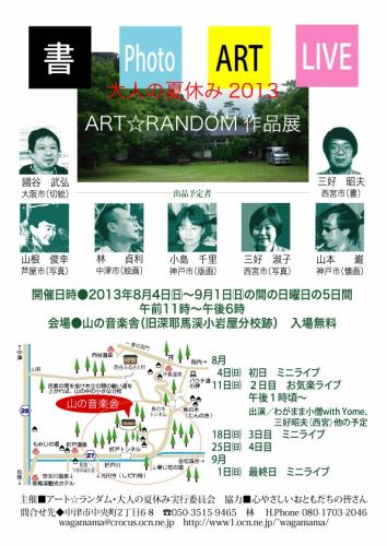大人の夏休みとART☆RANDOM作品展2013期間/2013年8月4日(日)〜9月1日(日) の間の日曜日のみの5日間 午前11時〜午後6時お気楽ライブ 11日(日)午後1時頃から 出演/わがまま小僧 with Yome 三好昭夫(西宮) 他未定2007年8月13日のライブわがまま小僧