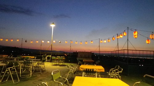 扇風機を点けっぱなしで寝たら、喉が痛い。このところ暑いから、車でもエアコン点けてしまうけど、体質的に合わんことは、あんまりやらへん方がええかも。しかし、この暑さは、耐えきれへん。まだ7月に入ったばかりやと言うのに、この暑さはどういうことや。去年まで、朝早く、ベランダの戸を開けて、表の窓をいっぱい開ければ、早朝の冷たい風が流れて、部屋も幾分過ごしやすくなってたけど。今年は、そんな冷えた空気が流れへん。部屋の中はどんよりとしたまま。そんな中、一服の涼風。ちょっと、レトロなビヤガーデン。時代をタイムスリップしたような何とも言えんこの感じ。遠くに海が見渡せ、鉄橋を窓に明かりを灯した電車が走る。ガタンゴトンガタンゴトン…。異空間に迷い込んだような時間。そんな時間を昨日は過ごさせてもらった。ここは、吉富亭。
