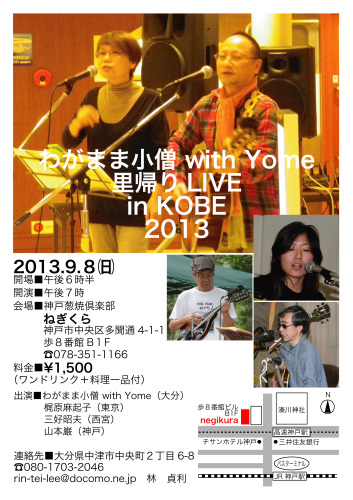 なんとなく肌寒い今朝。今日の週間天気予報では、神戸は降水確率60%になってる。晴れて欲しい。明日から神戸行き。今回は、孫に会うのが目的。やけど、ライブもします。9月7日(日)17時半 新門司発泉大津行き阪九フェリーわがまま小僧 with Yome 船内ライブ18時40分〜19時10分の間無料、言うても乗船せんと見れませんが。大阪方面へ行かれる方、フェリーはどないですか?9月8日(日)わがまま小僧 with Yome 里帰りLIVE IN KOBE 2013開場/18時半開演/19時会場/神戸葱焼倶楽部ねぎくら 078-351-1166 神戸市中央区多聞通4-1-1 歩8番館B1F http://negikura.han-be.com/料金/1,500円(ワンドリンク、料理一品付) 予約制。出演/わがまま小僧 with Yome 石井秀和(ベース、尼崎) トモコとマキコ(東京) 三好昭夫(西宮) 山本巌(神戸) ココワグマ?の予定。9月10日(火)17時半 泉大津発新門司行き阪九フェリーわがまま小僧 with Yome 船内ライブ18時40分〜19時10分の間わがまま小僧と九州へ行こう!とか言うたりして…。冗談やで。