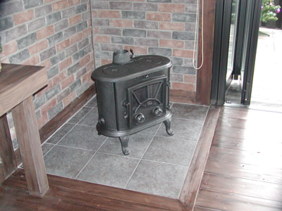 向こうの部屋のは薪ストーブに火がついてる。
