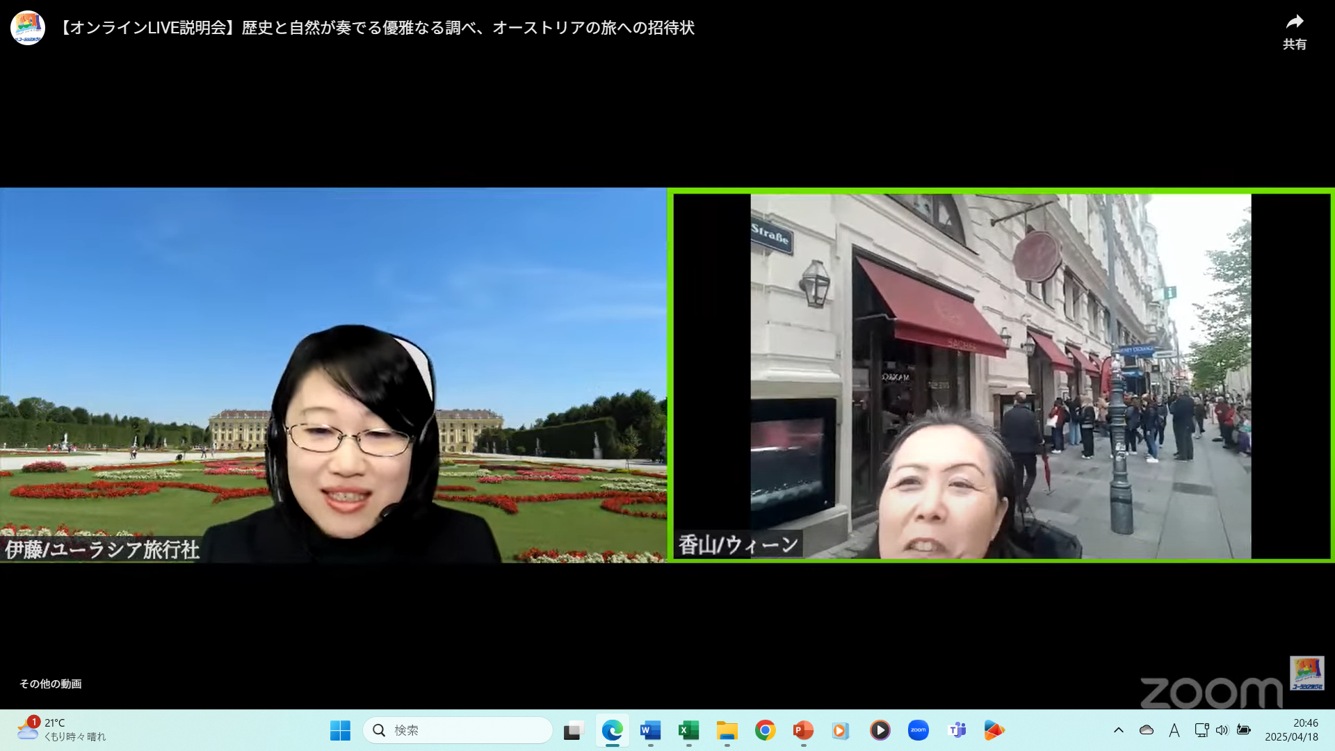 結構前だけど、ユーラシア旅行社が主催のオンラインツアーに参加しました。私が今まで行った中で、最も感動したのは、このオーストリアのインスブルックという街です。スワロフスキー本店のそばのカフェから、アルプスが見渡せて、度肝を抜かれました。今回は、ウィーンのツアーでしたが、まずまずかな。