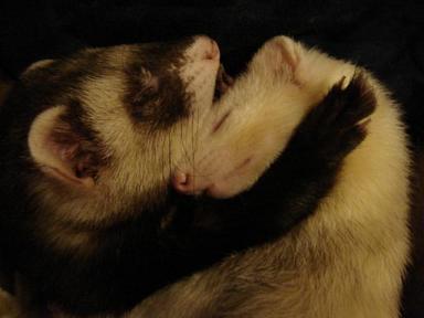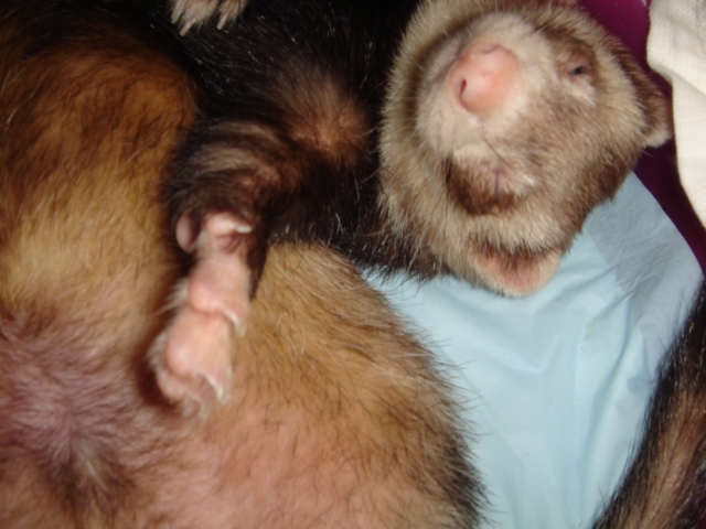 先日火葬し、本当に天国に行ってしまった熊ちゃん。実は、火葬の前に、お世話になった動物病院に献体しました。副腎のガンでした。以前の手術で半分以上摘出していたのですが、開腹の結果、副腎が225g(私のこぶし2コ分位)にまで超肥大していました。先生達が『天国にこんなのまで持ってゆかなくて良いよ・・・』と言って、摘出して下さってました。他の臓器はとてもキレイでずっと病気をかかえていた仔とは思えない程、しっかりしていた。とも言って下さいました。心臓は貴重なので、体に戻さずに、病院に捧げてきました。あまり悩まずに献体をしました。他の飼い主さん達からは賛否両論だと思いますが、私達夫婦の考えは『今後、他のフェレットちゃんのお役にたてたら。少しでも先生達の勉強材料になれたら。』でした。結果的に、熊のお腹の中から、巨大化したガンを取り除いて貰える事ができました。病院から帰宅した熊ちゃんは、お布団から顔だけ出していました。その姿はまるで眠ってる様で、なんか起き上がってくるんじゃないかと期待してしまうほどでした。今、お骨はねねちゃんと同じお部屋に置いてあります。これからは、ねねちゃんをしっかり見てゆきたいと思います。