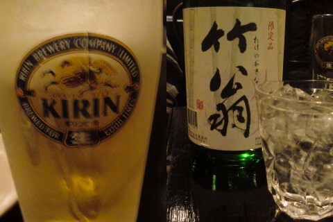 本当は今朝にアップする予定でしたが、強烈な二日酔いで日中は復活できず、今になって調子が出てきた感じです。 コメントの返信、来て頂いた方への訪問はこれからしたいと思います。m(_ _)m 昨日行って来たいつもの居酒屋さんへ。予約5分前に到着。友達も店に着いていて早速ビールでカンパイです。 くぅ~~、旨い! この為に生きている!! (言い過ぎかな?) この1杯で早くも焼酎に切り替えです。前回のキープボトル『竹翁』を飲み美味しさを再確認。サッパリしたロックに合う焼酎でした。 半分は残っていたのですが、2人で完飲です。この時点でいい気分でした。 ここからが二日酔いにさせた、悪魔のお酒たちです。 お店のお兄さんが、『滅多に手に入らない、日本酒の古酒を飲みますか?』と聞かれれば、断る理由が無く、『いただきます!』と即答です。 『まんさくの花 純米大吟醸 吟熟』7年熟成を頂きました。古酒を飲むのは初めての体験。飲むと味が凝縮されたトロッとした感じのお酒で、甘みのあるまろやかなお酒です。これはかなり『危険』なお酒(笑)です。素晴らしいお酒でした。そして、最後に次のボトルを入れることに。『むろか 園乃露』を入れました。最初はお湯割りで頂き、後はロックで。 お湯割りで飲むと香りが口の中で広がってきます。ロックでも美味しいですが、度数が確か30度なので、ちょっとキツイかな。 閉店まで飲んでいて、この時点でふらふらで、家に帰ったらすぐに寝ていました。 嫁に『部屋が酒臭い』と怒られ、しかも二日酔いで家でゴロゴロ・・・。申し訳ない1日でした。嫁と娘に、ゴメンナサイ。。。
