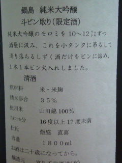 天気が今日も良いので、近くの駅ビルに行ってきました。特に目的は無いのですが・・・家でゴロゴロだと勿体無いかですらね。 お昼過ぎに帰ってきて、子供のお昼ねのお付き合い。。。(爆睡) そして起きたら今晩の、晩酌タ~イム! 今日は、『鍋島 斗瓶取り 純米大吟醸』です。元旦に開栓したお酒を頂きました。 一口で『鍋島』のお酒と分かる味、注ぐ時にお酒に『とろみ』がある感じで、お酒の色は若干琥珀色ですね。口に含むと口の中で香りと味が長く続きます。 そして、後味に若干の酸味がさわやかにしてくれるお酒です。アルコール度数も若干高く16~17度なので、ピリッとして甘さがしつこくないですね。 このコクと味が大好きな私は、昨年も多くの『鍋島』を頂きました。今年も呑み続けたい日本酒の1つです。