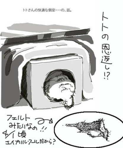 大変、ご無沙汰しておりま~す! 今日は、我が家の、ビックリニュースの、お知らせで~す! 三月末頃・・・ 旦那が、「トトの部屋に、ボロい布がある」・・・って、言うのです。 まぁ、ハンカチだか、靴下だか・・・ 何かボロを持ち込んだんじゃないの~?なんて、 思っていたのですが。 「違う!」って、言うのです。 旦那も、何か?と思って、つまんでみたそうなのですが。 「トトの毛でできた、フエルトみたいな感じ」・・・だそうで。 気持ち悪いから、そのまま、放置したそうなのですが。(なんで、放置するかなぁ~!?・・・捨てりゃ、いいに!) で・・・今もあるのか尋ねると、 「今は、なくなっている」と、言うのです。 なら、仕方ないか・・・ まぁ、どこかから、ボロ布を、持ってきたのだろうと、 私の中では、結論に、達しました。 旦那は、解せない風で・・・ 「トトが、反物、織っていたのかも」なんて、冗談言っていたのですが。 数日前・・・エイプリル・フールの頃・・・ (だからって、嘘じゃないのですよ~♪) 旦那が・・・ 「トトの布がある!」・・・って、言うのです。 これは、一度、確認しなくては!・・・と、 トトの部屋を覗くと。 入口近くの角に、確かに、布が・・・ギョギョッ!(さかなクン風。) これ・・・何~? ちょっと、気持ち悪いけれど、つまみ出してみました! おおお~!なんと! これって・・・明らかに、 トトの抜け毛でできた、フエルトじゃ、あ~りませんか~!? 厚みも、均等だし・・・表面が、滑らかです~♪ ウッソ~!? 目を疑いましたが、現実で・・・もの凄く、ビックリなのですが。 あんまり、気持ち悪かったので・・・ (何で~!? 鶴の恩返しじゃあるまいし・・・ 自分の毛で、布織っているの~!?) 即、ゴミ箱に、ポイしたのでした。 でも、後日・・・ 旦那が、猫の布について、検索したところ・・・ あるんですって~! 猫が、寝床に、自分の毛で、フエルト状の布を作ることが~! 「夢じゃなかった~!」・・・って、感じです! 今にして思えば・・・ 実物を、とっておくのは、ちょっと、気持ち悪い感じですが、 せめて、写真だけでも、撮っておけばよかったなぁ~!なんて、 残念に、思ったのでした。 去年の冬に、新築したトトさんの部屋ですから・・・ 4か月くらいで、5センチ☓10センチ四方の布を、作ったみたいです。 現代版、トトの恩返しなのか? 老後の楽しみ、手芸猫なのか? 今度作ったら、写真にとって、 皆さんにも、ご覧いただきますねぇ~♪