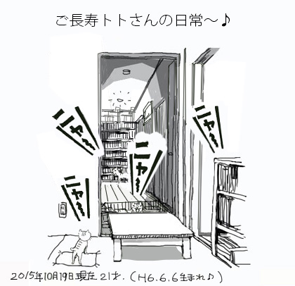 大変ご無沙汰しておりま~す! なかなか、いろいろなことが、落ち着かなくって・・・ ブログの更新も、ままならず。 そのゴタゴタのひとつが・・・これ! 実は・・・ 高齢トトさんが、どうやら、全盲になってしまったようなのです。 今月(10月)の10日頃から、まったく見えなくなってしまったようです。 以前から、「ほとんど見えてない」と、お医者さんから、言われてはいたのですが、 多分、明るさも、無くなってしまったのではないか・・・と、思います。 一時は、 トイレがわからない状態だったりして、廊下でそそうをしたり・・・ それを片付けるにも、結構、大変で・・・ 廊下が、ペットシートで、埋め尽くされていました。 そんなことで、 現在、廊下の入り口付近に、トイレを移動して、 亀太郎用に買っていたゲージで、廊下の先に、進めないようにして、 やっとこさっとこ、 用が足せるように、なりました~! ピンボールのように、ぶつかったら、跳ね返りながら、 クルクルと徘徊しながら・・・ ご飯を食べ、トイレに行って、ホットカーペットで寝る。 これを繰り返しながら、一日が、過ぎて行きます。 廊下の入口にトイレは・・・ 究極の選択、っぽい、苦悩がありましたが、 今や、これしかない!・・・と、言う感じです。 旦那がいろいろとネットで検索したところ・・・ 猫の高齢化に伴って、 高齢ネコの失明も、増えているみたいです。 高血圧から、失明するらしいです。 トトさんも、片目の眼球の下の方が、赤くなっているのですが・・・ これも、何とかいう症状で、猫には、よくあるそうです。 全国に、高齢ネコは、いっぱいいて・・・最高齢は、26歳だそうです。 旦那レポによると・・・ 26歳と21歳の猫を飼っている方のHPを観たところ、 そのお宅の猫さんと比較すると・・・ トトさんの見た目は、26歳の猫さんに、近い感じだそうです。 ちょい、ボロッちぃ~!? 世間の21歳ニャンコは、もっと、バリバリ元気なようです! とても、26歳までは、生きられそうも、ありません! まぁ、これも、それも・・・個体差ですよ、ねぇ~♪ また、カメ太郎さんは・・・ 変わりなく、ベランダガメのまま、元気です。 今日はよく晴れているので、日向ぼっこです~♪ とりあえず・・・トトさんと、カメ太郎さんの近況でした~!