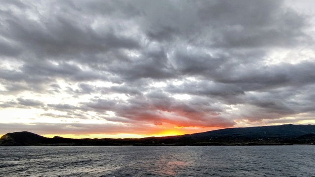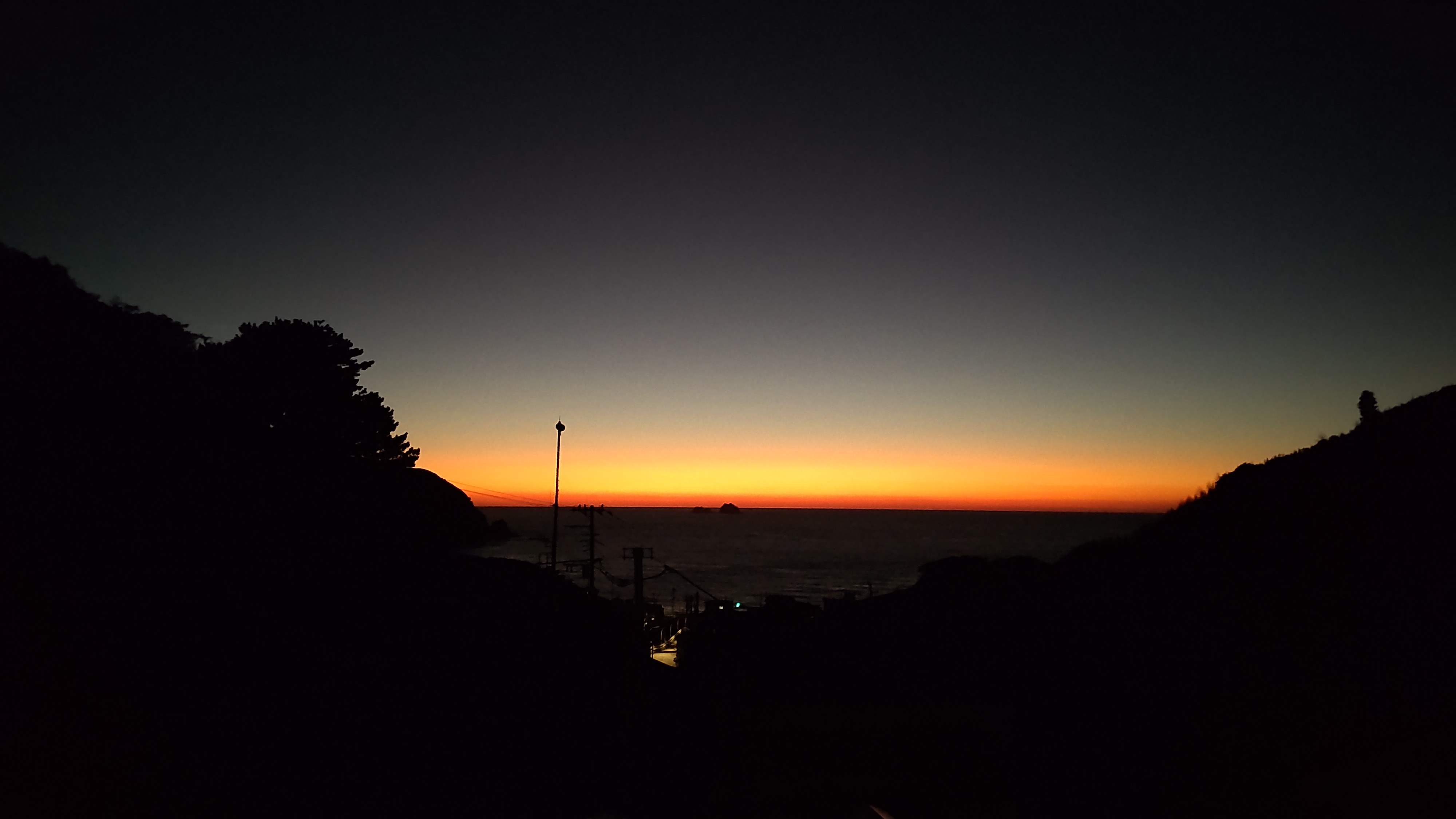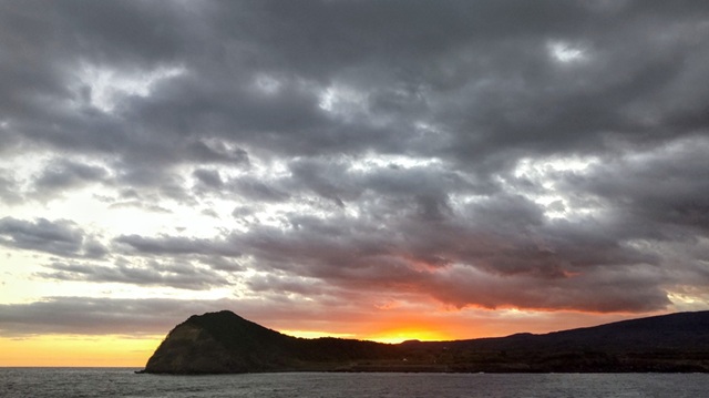 伊豆大島出航して、やっと目が覚めたのでデッキに出て日の出でもと_大島の向こうに日の出![]()