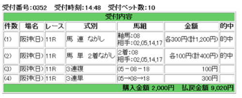 狙っていたダイワパッションは消しデータに該当したので、他の馬を探したら、“KISSドンブリもありえる・・”と思った。キストゥヘブンはオークスの狙い目と思っていたから、ここでは来てほしくないと思いつつ、今日の桜花賞予想は、 馬連 8流し 2.5.14.17 馬単 8(2着)流し 2.5.14.17 それと昨日の日記に書いた夢馬券。結果は 1着 14 キストゥヘブン 2着 8 アドマイヤキッス何年ぶりやろ? 桜花賞当てたの。ベガの時って、平成5年やったかな?・・さぁ、来週は皐月賞。小遣いは少ないのやから、コツコツいかんと宝塚記念まで財布がもたん。 消去法シークレット・ファイル(2006ー2007) 馬単・3連複を狙い獲る消去の法則