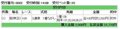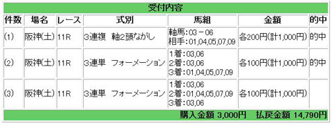 土曜日阪神第10レース稲川特別、1着は1番タガノエルシコの指定席。 そうなれば買う馬券は3連単1着流し。 1→ 4,5,6,8 ここで9番サザンギラクシーにも流すが悩む。 悩んだ末、切ってしまったら 結果 3連単 1→4→9 配当8390円 ・・・落ち込む。。。 次の11レース大阪スポーツ杯は3連複6頭ボックス20点勝負。 結果は配当2020円が当たり、プラス20円。 ・・・外れたよりかマシか。。。 土曜日がこんなもので、日曜日は阪神10レース逆瀬川特別だけ買うことにした。 軸は9番ダイシンプラン。 3連単で勝負すするか、1番テイエムアタックとの3連複流しにするか悩む。 しかしテイエムアタックの馬体重がプラス8キロを見て、9番1着の3連単流しに決める。 9→ 1,2,4,6,7 土曜日の事もあり、4頭にせず5頭に流す。 そしてダイシンプランは期待に応えてくれました。配当21770円。 このところ負け続きだったから、この配当は嬉しい。 父馬タイキシャトル共々、私に稼がせててくれました。 来年はぜひマイルCS親子制覇を成し遂げて欲しい。 人気blogランキングに1クリックよろしく。人気blogランキングへ