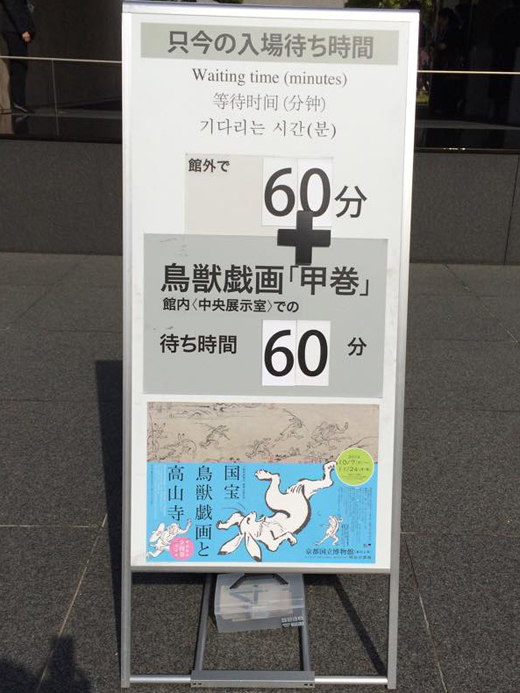 京都国立博物館へ行きました。目的は国宝鳥獣戯画。でも・・・朝からもうとんでもない行列。屋内に入れるまで外で1時間待ち。中に入って、それからさらに1時間待ち・・・上野動物園のパンダか、はたまた大阪万博の月の石か。。。ヘルパーさんの勤務時間が過ぎてしまう。博物館の玄関で、あきらめて引き返しました。10年くらい前にも京都国立博物館で鳥獣戯画の展示がありましたが、この時は最寄り駅にエレベーターが無く、そこで引き返しました。前回よりかは少し近づけたけど・・・。いや、そういう問題じゃないよな。【楽天ブックスならいつでも送料無料】京都カフェ(2015) [ 朝日新聞出版 ]価格:972円(税込、送料込)【楽天ブックスならいつでも送料無料】お昼の京都本 [ 京阪神エルマガジン社 ]価格:699円(税込、送料込)岡江久美子さん絶賛おせち!楽天ランキングおせち板前魂の曙 和洋風五段重おせち料理 アワビ...価格:17,980円(税込、送料込)限定商品★伊勢海老のテルミドール入和洋風三段重お節料理全47品約5人前★/おせち予約/和洋風お...価格:15,130円(税込、送料込)こちらもよろしく。ブログ人気ランキング投票にワンクリックをお願いします。 ツキを呼ぶかも?