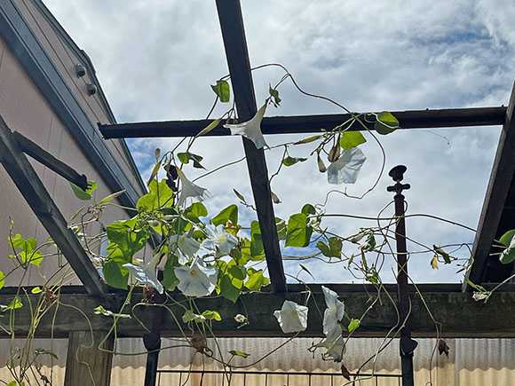 台風で朝顔のツルが全部塀の外側に垂れてしまった。 ご近所トラブルになる前に塀の内側に戻す。