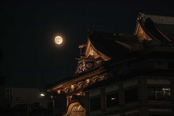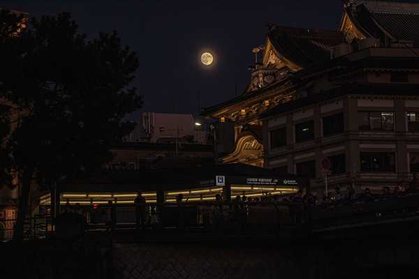 三条大橋の下から月の出の瞬間を撮影したら、急いで河川敷を南下。四条大橋の下に着いたときには月に気がついた観光客でベストポジションは占拠されていたが、その後ろに三脚を立てて撮影した。