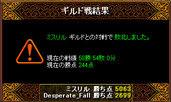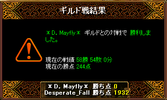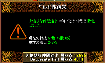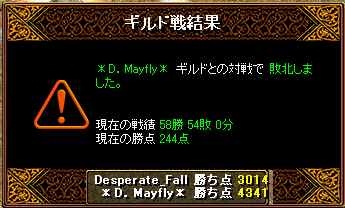 8月も終わり日にちも代わり9月になりました・w・というわけで更新してみましょw本日Gvあったので結果だけですがうp↓↓↓残念ながら結果は負けでした;w;次回頑張りましょ・w・b全体的に職不足が否めない凹○コテッ剣士とか剣士とか剣士とか・・・・・本日は特に何もないのでこれにて終わり・w・ノシ