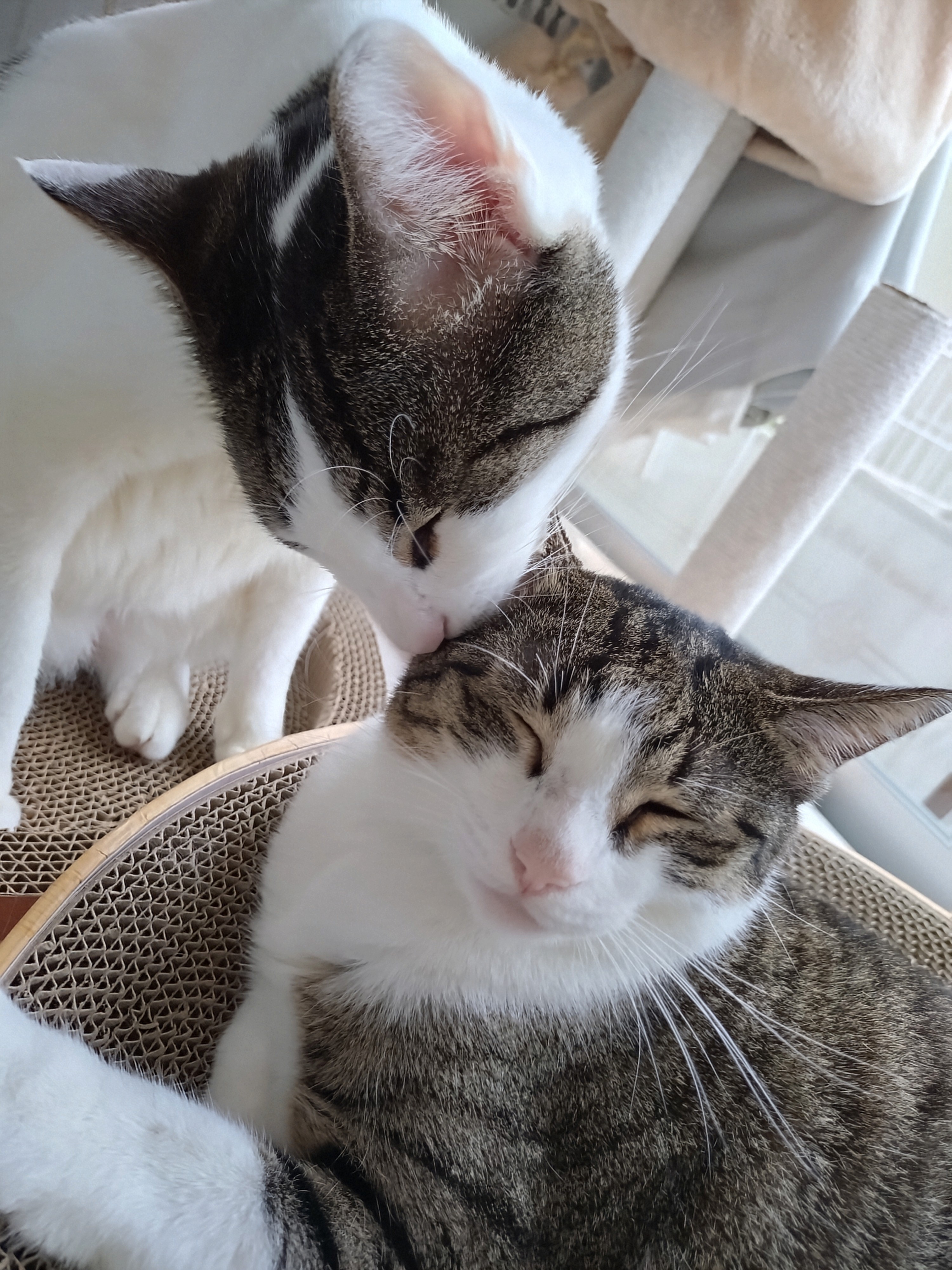 しろニャン♪はなニャンを舐め舐め♪毛づくろいニャ♪はなニャン♪いいあんべぇ〜😹😹優しいしろニャン♪毎日毛づくろいしてもらってるニャ〜😸はなニャンもお返ししろニャン頭舐め舐め♪毛づくろいニャ〜😻😻ハグハグ ハグハグ ムギュー😹😹お互い舐め舐め♪♪毛づくろいニャ〜😹😹仲良く??お互い毛づくろいしすぎて…その後……ケンカ?? ニャプロしたニャ〜〜〜😹😹みんニャ〜良い1日をお過ごしニャ😺😺