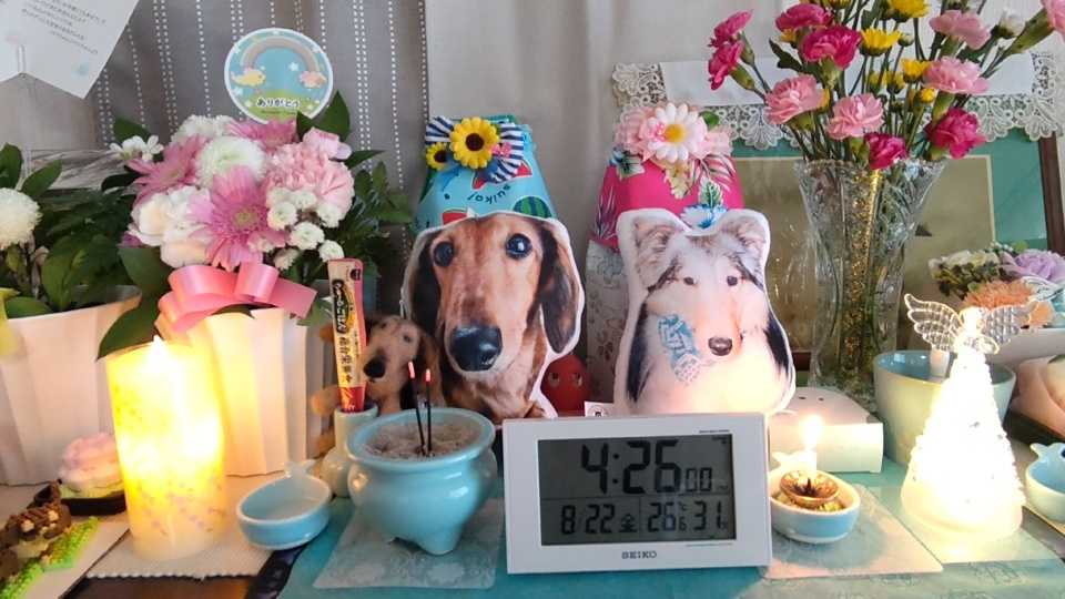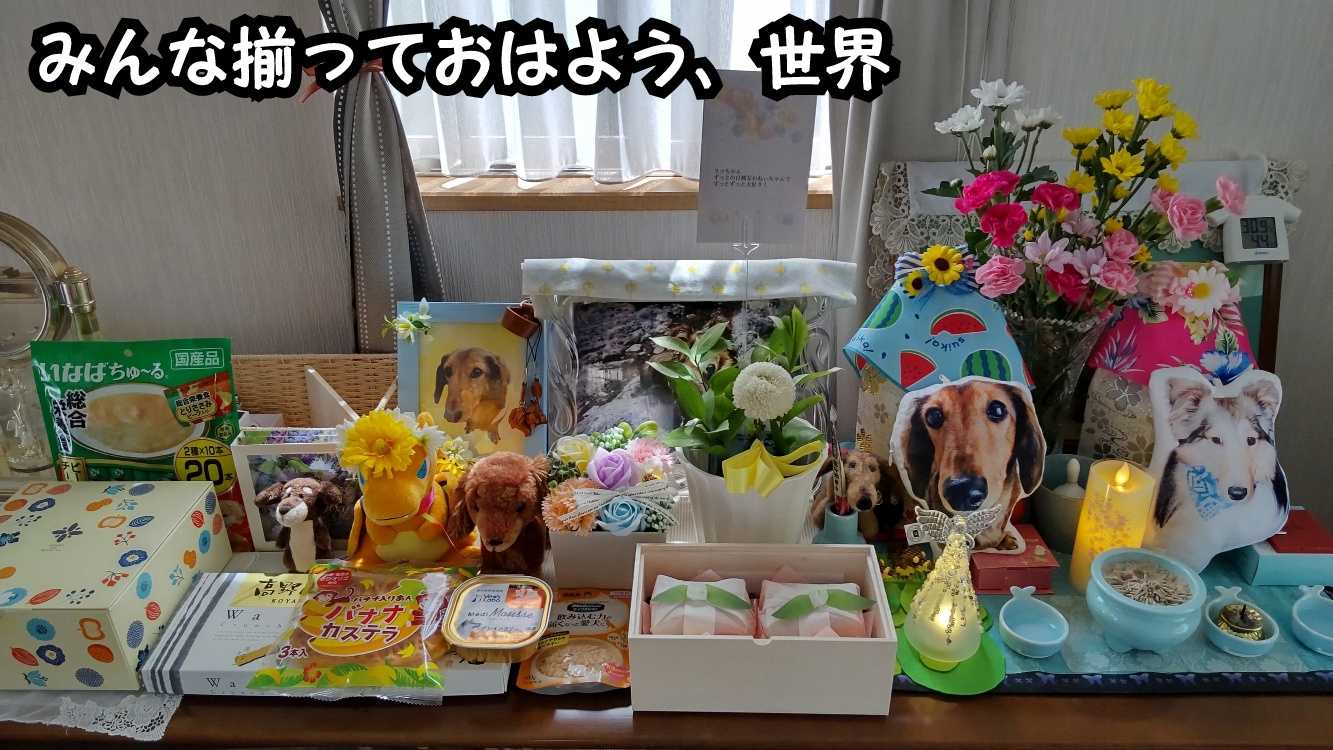 皆さま、おはようございますm(_ _)m終わっちゃったねーー(><)終わっちゃったよーー(><)昨日はラテの一周忌を偲んでくださり優しいお言葉を沢山掛けて下さり本当にありがとうございました<(_ _)>皆様のお陰で楽しい初盆weekを過ごせましたその流れでとてもいい感じで一周忌を迎える事ができました一周忌が悲しいものにならずにラテと楽しく過ごす事ができました偏に皆さまのお陰でございます昨日はずっとラテに食べさせてました一年前と同じことしてました何回やり直しても同じ結果なんやとワタクシ悟りました(ーωー;)後悔してる事をまたやってまう人間だと(TT)そして、一々写真を撮ってました(汗)ふと思ったんですけどなんでラテいてる時にもっと写真撮ってなかったんやろ?特に動画は今一番欲しいもん。今更写真撮っても仕方ないのに(TT)パ「ラテは瞬間わざと動くから撮られへん」あぁ、そーやったそーやっただから写真の殆どがブレブレか途切れてる(;;)祭壇は動かへんから思いのまま取り放題しかし、つまらない写真上手くいかないものですね!!ダ~メだこりゃ(((;°▽°))えっとー、ラテは立派な天使様になったのでは??ここから、、、一年と一日からが本当の試練かも?皆さんはどう過ごされてるのだろうか・・・#ミニチュアダックス ブログ村ハッシュタグ遊びに来てくださりありがとうございますm(_ _)m↓ポチっと応援していただけると嬉しいです(*ˊᵕˋ*)にほんブログ村