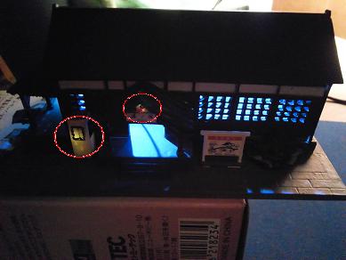 わんこ鉄道本社に照明がつきました! 壁のつなぎ目にプラリペアを流し裏側を黒で塗って光が漏れないようにしました!それと赤丸の部分公衆電話とオレンジの照明も付けてみました!