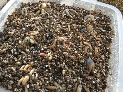 吸水5日目。膨らみましたねー。昨日からバーミキュライトを追加して夜間は外に出してみました。今朝6時すぎ、吐く息が白い。温度計は10度。すっかり寒くなったなぁ。早く芽が出ないかな~。球根についている色は種類が混ざらないようにつけた印です。去年はこの時点でカビだらけでどうにもならなかった事を思えば進歩したかな??ただ、まだ油断してはならない!毎朝チェックしつつ霧吹きで水分補給している時間が楽しいひとときです。http://mizkygarden.seesaa.net/