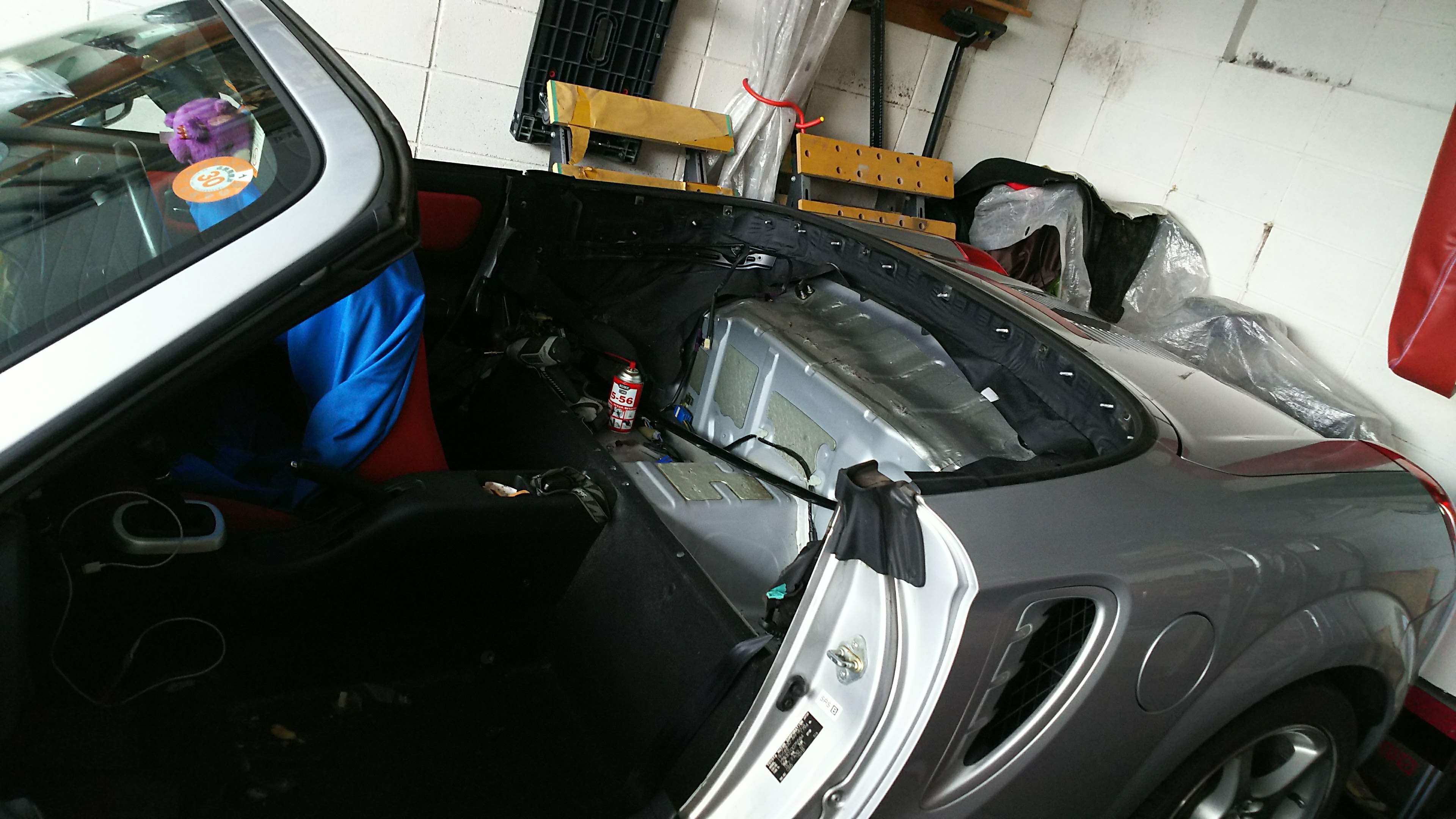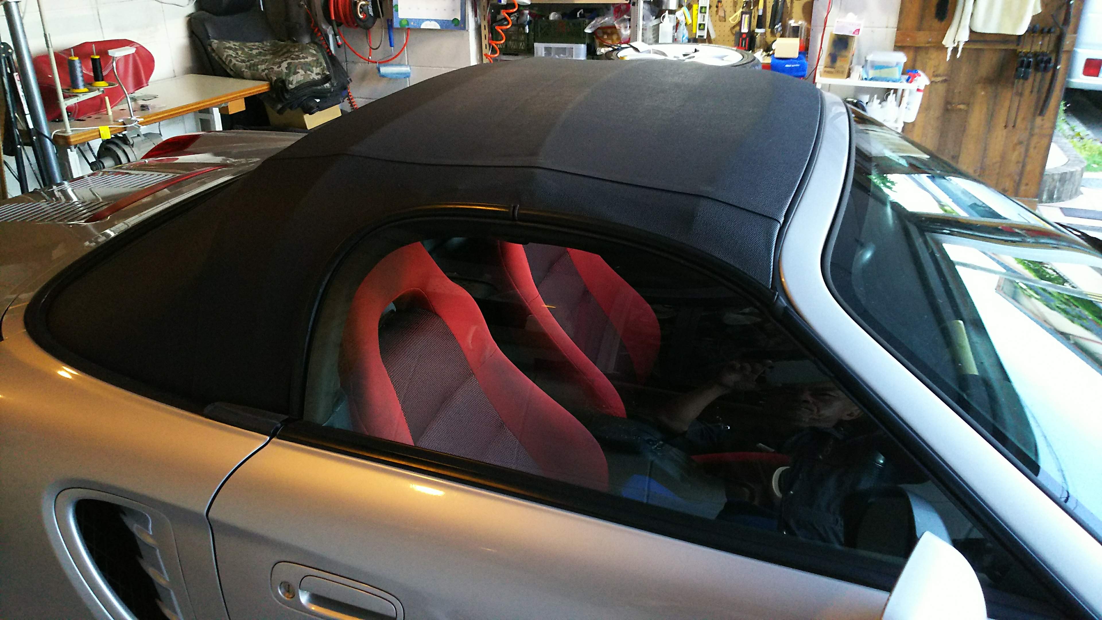 ソフトトップは純正今でも、純正生地があるようです!助手席シート外して、後ろのラゲージスペースすべて取ります。ピラーごとソフトトップを外すと、こうなります。古い生地を張替え、組み上げて完成!綺麗になるときもちいい!!