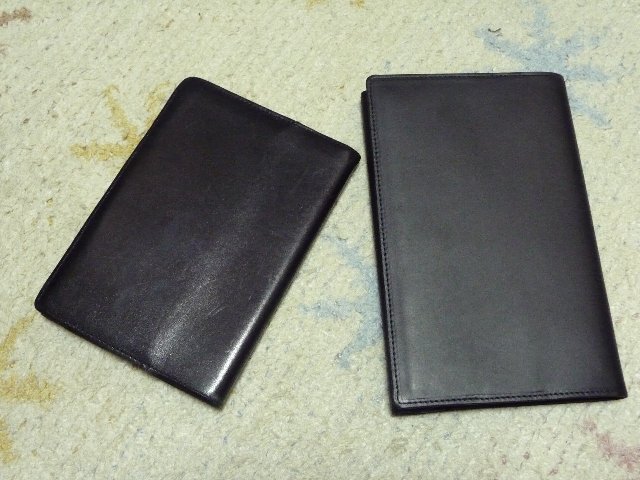 電車に乗るときに本を持っていないと落ち着かないで、社内広告に読み耽ってしまう程の活字中毒症なので、鞄に文庫か新書を2冊くらい常備しています。(それより大きい本は重いので、あまり通勤途中で読むことはありません。)その文庫と新書のためのカバーがこれ。無くては困るというものでもないのですが、軽装の本を保護するためにも、何を読んでいるのか他人に悟られないようにするためにも、あった方が良い。(興味の対象を知られるのは、何となく気恥ずかしいものです。)でも、書店で付ける紙のカバーでは色気が無い。というわけで、革のカバーを使っています。例の土屋鞄工房の職人の手作りです。文庫用のは大分前から使っていたので、革が馴染んで光沢が出てきています。新書用のものは最近発売になったので喜んで買いました。どちらも中身が10冊以上買える値段だけど、長く使うものですから、少々贅沢をしています。ついでにペンケースも揃えて買ってしまいました。