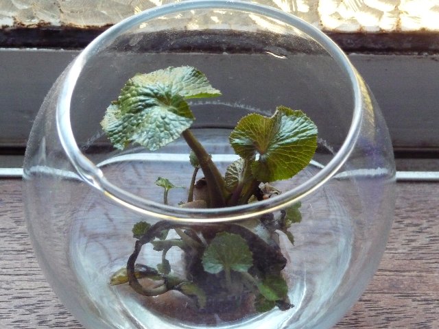 水の綺麗なところでしか育たないと言われる山葵ですが、我が家でも育てております。というほど大袈裟なものじゃなくて、使い終わった生山葵の茎の付いている部分を水に漬けておいただけ。要するに水栽培ですが、時々水を替えてやると葉が出てきて、なかなか美しい。ちょっとした観葉植物にしている訳ですね。これは年末に築地で買った山葵で、使い終わって活けてから2週間くらいの状態です。ちなみに、山葵は根の先の方じゃなくて、茎の付いている方から摩り下ろすのが正しいそうです。