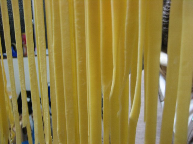 先週に引き続いて、今週もパスタ打ちをしました。今回は水曜日に遊びに来る「やじけん」くんに食べさせるのが目的ですが、平日に最初からやっている時間は無いので、休みの日に作っておこうというわけ。保存するために、少し干してみることにしました。 しかし麺類は長いし、量は多いし、干すのも場所がいります。思わず「パスタ干し機」とか買ってしまいそう。おばあちゃんの田舎である栃木で長く暮らしたことのある妻は「干瓢干し」を思い出すと言っています。さて、今度はどんなソースを作ろうかな。