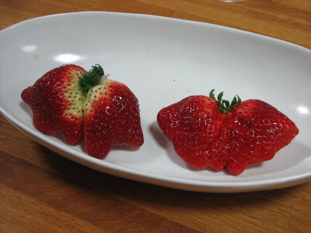 この時期は苺が安くなりますが、店の閉店間際は更にお買い得になるのは御存知の通り。夜の8時頃に仲良しのお兄さんがいる果物屋で買った苺、今日は2パック500円と激安でした。それで箱から出してみたら、こういう面白い形の苺があったわけ。タイトルはフランス語で「苺の蝶」という意味です。