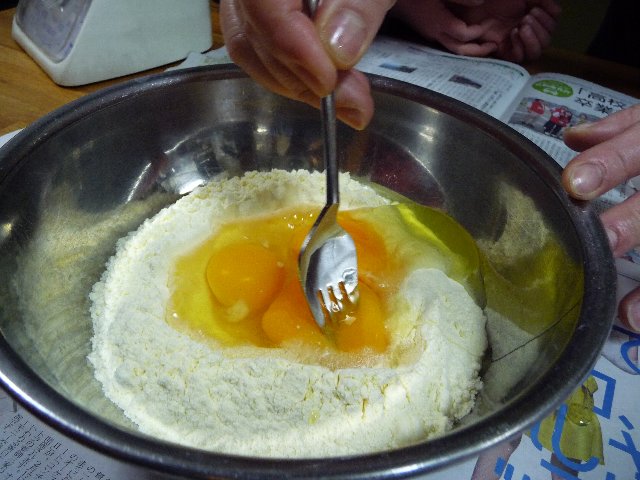 セモリナ粉の山の中心に卵を加え、フォークで卵をつぶしながら粉と卵を混ぜて行きます。ある程度混ざったら、オリーヴオイルと塩を加えて更に混ぜ込みます。ひとつにまとめて練りますが、結構体力が必要です。今は亡き「八十甚」の岩月さんが、蕎麦を打っていた姿を思い出します。子供は面白がって手を出しますが、子供の力じゃ不足なので、パスタ打ちの本を参照して足で踏むやりかたにしました。練りあがったものを寝かします。メロンパンみたいですね。その間にパルミジャーノをグレーターで削って食べる準備。(おうちでパスタ・その2に続く)