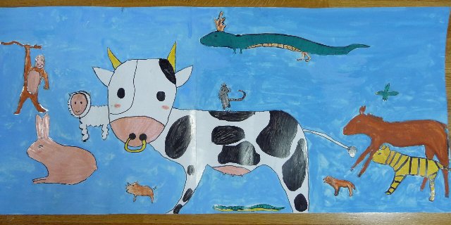 何を思ったか息子が描き出したのは、十二支の動物を並べた絵でした。姉たちも色付けには多少協力しましたが、一年坊主の作品にしてはなかなか出来が良い。今年の干支である丑は主役の座を獲得していますが、どういうつもりで他の動物の大きさを決めたのかは謎です。