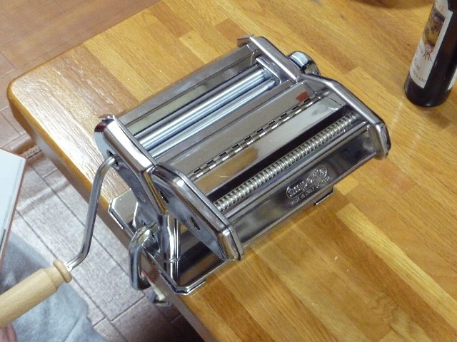 新兵器のパスタマシン。こういうものを買うことになったきっかけは、下の娘がお年玉でおもちゃのパスタマシーンを買おうと考え出したこと。それならパパが本物を買ってあげると言って(ホントはパパも欲しかったので)手配したのですが、娘はパパにお金を払って自分のものにする気でいます。イタリアの有名メーカーの製品ですが、合羽橋の問屋から取り寄せたので、実はおもちゃのパスタマシンより値段が安い。切り分けて手で平らにし、パスタマシンにかける準備。伸ばしているところ。これは楽しい。ローラーの幅を狭めながら、何段階かで麺を伸ばして行くと、かなり長いものになります。出来上がったパスタ・フレスカ。皆興奮していて、カットしているところの写真は撮り忘れました。少し時間はかかりますが、週末に皆で楽しみながら作るには良い道具ですね。美味しいパスタの完成!最初のソースはオーソドックスなポモドーロ。もちろん自家製です。それでは、いただきます。