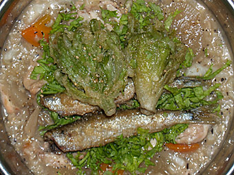 よくラーメン作ります。小学5年生くらいからインスタントラーメンに野菜やお肉を入れて作っていました。インスタントの袋物はもちろんなんですが、今では生麺の方が多いです。麺は生麺なんですが、作り方はインスタントなんですよ♪どんぶりに、塩・醤油・コショウ・味の素・ほんだし・ごま油だけ入れておいて、お湯と茹でた麺を入れれば出来上がり!刻みネギやシナ竹・ワカメ・めかぶなんか入れたら完璧っス!生麺(細麺)の茹で時間は1分半から2分くらいなので実はインスタントラーメンより早いのです!これが以外に美味しくて評判も上々、夜食によく食べています。とんこつや鶏がらも使って色々やってみているんですが、今日は親戚にもご馳走しようと頑張ってみました♪スープの鍋は2つ。ひとつは鶏がらと野菜や・干しいたけ。もうひとつは昆布・にぼし・削り節。どちらも煮立たせないようにじっくり旨みを抽出します。合わせスープにネギ油・ゆで卵・シナ竹・海苔・刻みネギ・・・中華そばかな?「これならお店を出せるよ~」、「美味しい~」・・・などとみんなに喜んで頂きました~♪こんなに手間と材料が掛かるラーメン屋さんなんかもちろんやりませんが。。。こんなに長々と書いたのは何のことはない・・・・・その黄金色のスープでチェリーのごはん作ってみました~(笑)見た目は何も変わりません・・・・・煮干の頭と腹・ダシをとった昆布入ってます~♪昼はふきのとう採って来ました。地上に見えているヤツじゃなく枯葉の下から・・・ふきのとう掘り♪匂いを嗅がせて「さがせっ!」っと云ったんですが、わかってるんでしょうか?ふきのとうは天ぷらで頂きました。残りはふきのとう味噌にする予定です♪