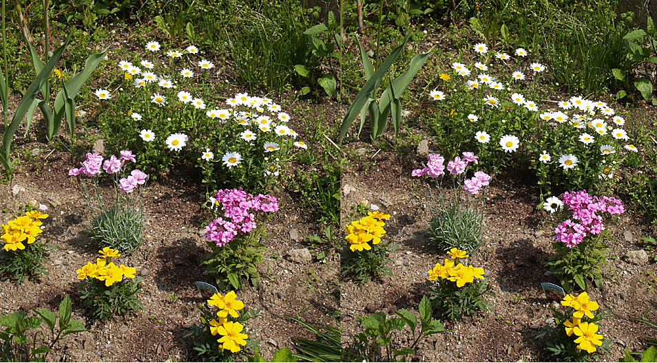 交差法という、いわゆる「寄り目」にして画像を重ね合わせて見る方法で、立体的に見えます!
