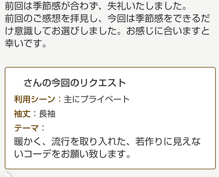 昨日の夕方に届いたエアークローゼット。寒すぎて「交換してもらおう」と返却していたのだ。まずはスタイリストさんからの言葉と、私のリクエスト。もうね、暖かいことを最重点に置いたよ。スタイリストアドバイスはこちら。ワンセレクトに薄いブラウスとかシースルーニットとか以外だと黒しか無かったんだよ。黒は着たくないと書いたのだが、流行なんだろうか?柄があるからという理由で、黒だけど仕方なく選んだニットである。先にも書いたように「仕方ない」という選び方をしたニットウール(ウール混でも無い)では無いので化繊の温かさに不安はある。厚みのあるニットなので持った感じでは暖かいと思いたい。こういう明るい色は好きである。特に秋冬は明るい色を着たくなる。微妙に襟にメイクが付かないかと不安胃は鳴るが暖かそうなので良い。私は寒がりの冷え性なので、三首は冷やさない、出さない。垢抜けに必要とか書かれていてもガン無視する。垢抜けて見えても寒くて、健康不良になるのは御免被る。冷え性なんだからしっかり着込む。暖かい服を着こんで武装するのが寒い季節の私流である