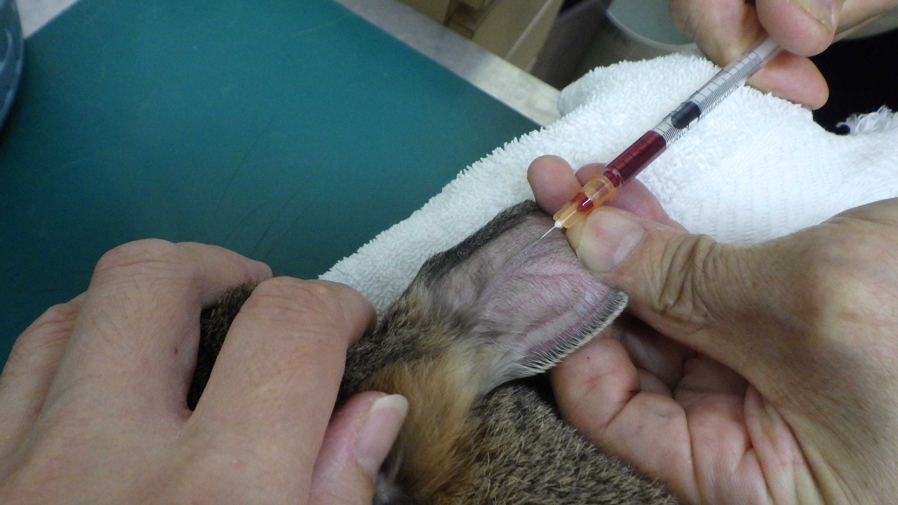 うさぎさんの採血時、つまり、血液を採取する方法として『耳』から 血液をとることがあります。わんちゃん、ねこちゃんの場合は、血液検査をするのに足りる量の採血をしようと思うと、腕、もしくは後肢、もしくは 首の血管に針を刺して血をぬきますが、うさぎさんの場合は、『耳』から 血を抜く方法があります。↓ ↓ ↓ ↓ ↓耳の血管を利用して採血を行い、圧迫止血。大きな耳をもったうさぎならではの方法です。腕の血管を使うよりも保定の負担も痛みも少なく、終わってからも ケロッとしています。病院が嫌いなうさぎちゃんもこれなら大丈夫かもしれませんよ。