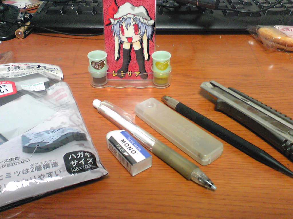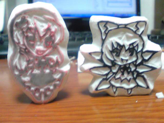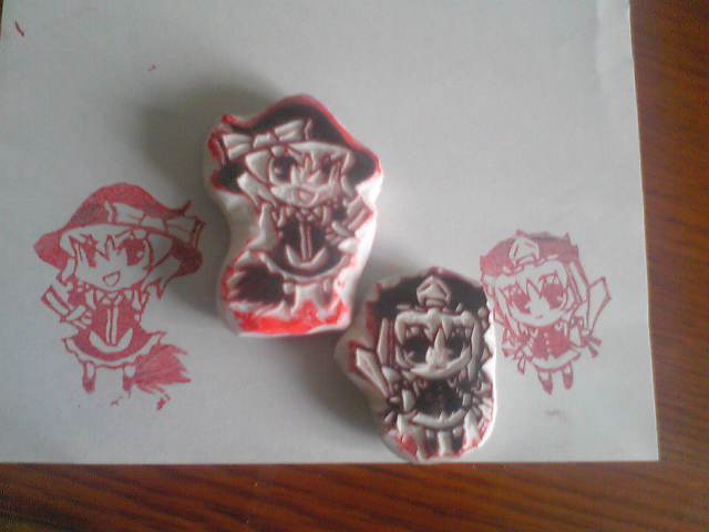 あちこさんがケシハンやってみたいとおっしゃられてたのでこんな感じでやってます的な製作過程を公開何事においても自己流な自分なので今回も自己流です。ちゃんとやりたい人はぐぐってね☆今回は千咲亭りずさんから注文をいただいていた鍵山雛の制作です。1.必要な道具をそろえるケシハン用ケシゴム・ケシゴム・シャーペン(鉛筆)・トレーシングペーパー・デザインカッター・カッター・ハンコ用インクケシゴムとシャーペンはデザイン用に使います。カッターは無くてもいいです。あとで説明しますが、外側の要らない部分を彫るときに広い範囲を彫るときに便利なので一応準備しました。だがしかし僕は使ってません(ぁ彫刻刀の三角刀などで彫っても良いですが、細かいところが難しいのでデザインカッターがおすすめです。2.デザインを描く。今回は文字も入れていくので文字と絵がしっかり入った上で成り立つデザインを考えていきます。今回の場合、雛の顎の下にくる髪の毛が文字の間に入るといい感じにバランスがとれました左の図がラフ、真ん中の図が実際に制作するサイズにあわせて清書したものです。ケシハンの場合、通常は2色で構成されるので清書の時点でどこを残すか(色がつくか)どこを彫るか(色がつかない)を決めます。ここで色を塗って完成イメージを作るとなんかいい感じです。右の図はケシゴムに図を転写したものです。転写する際はトレーシングペーパーで清書をなぞり、消しごむにトレーシングペーパーをあててこするのがいいかと。清書の紙でそのままこすり付けてもいいですが、ずれたり色が薄くなったりすることがあるのでおすすめはできません。トレーシングペーパーでやった場合でも多少うまく写らない部分が発生します。そのような時は直接鉛筆などで描いてしましましょう。ここを怠ると後で間違えて彫ってしまったりします。清書で黒く塗ってある部分が彫らない部分なんですが、僕は転写するときは黒く塗りません。特に理由は無いですが、なんとなくです。転写のときに黒くしてしまっても問題はありません。めんどうですが。3.ほりほりでは彫っていきましょう。デザインカッターで彫る部分がVの形になるように彫っていきます。彫る範囲が広い場合は分割して彫っていきます。外側を先にやってもいいですが、僕はいつも先にキャラクターを完成させてます。やっぱりこれも明確な理由はなく、あえて理由をつけるならば外側は簡単なので先に難しい部分をやっておいてあとで楽をする程度の理由です。髪の毛の光の部分は一気にやることも出来ますがコツコツひとつずつやっていったほうが多分きれいに出来ます。ちょこちょことやっていってとりあえずキャラクターの完成にいたりました。難しいのは顔ですね・・・。鼻と口はすごく細くなるので間違えて彫ってしまわないようにカッターの刃の長さに注意しながら彫ってください。ちなみに、目の光としてぬいてある丸ですが、今回は普通に彫りましたが刃を立ててぐるぐるまわしてもほれます(?)キャラクターができたので今度は外側と文字を彫っていきます。まずはキャラクターの縁取りをします。そしたらカッターがここで登場します。一気にごっそりとってしまいます。先ほど彫った溝の深さよりも浅い、もしくは同じ高さにしないとカッターの刃の先端が見えないのでキャラクターの線を取ってしまいかねないので気をつけてください。文字は細かいだけです(ぁ文字は難しいので多少ごまかすのが大事です。今回の場合、「咲」「亭」に含まれている「口」をただのしかくにしてしまいました。これは彫ってもそんなに苦ではないんですが面積が大きくなるので文字が入らないといった不具合が発生するために省略しました。んで終わりました(ぁ左上の空白はカッターを使わずデザインカッターでやりました。この場合は、空白の部分をデザインカッターの刃で切れる長さに分割し、斜めではなく縦にいれちゃいます。もちろん、キャラクターの縁取りは斜めで今までどおりしてください。空白部分の分割のみ縦に刃を入れてください。そこをカッターを同じようにやってけばいいです。全体的に説明になってませんがようはやってみたほうが早いってことですね(ぁインクをペシペシつけます彫っただけの状態だとなんか怪しいけどインクつけるとそれっぽく見えてきます。ぷっしゅとりあえず一回おします。そしたら気になった点を修正します。とりあえず出っ張ってるところと「千」の字を修正することにします。下が修正したバージョンここで完成ということになります。作業時間は大体1時間半です。デザイン20分、ほりほり1時間10分程度です。予想よりはるかに簡単ですので一回やってみてください。わかんないことあったら質問受け付けますわかんないことばかりだけどなんでそんなに説明下手なの?とかいう質問は受け付けません←