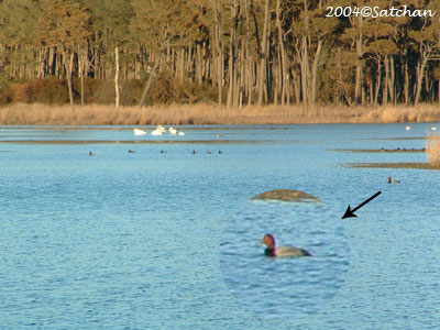 RedheadAythya americanaAnatidae カモ科アメリカホシハジロ20 inch (50 cm)デジスコ導入前の想い出の写真♪Redheadだけ、拡大してみました。Assateague Island National Seashore, MD & VAにて。2004.02.07************************************** メリーランド州東部のアサティーグ島国立海浜公園へ行った際、白鳥や他のカモ達の中に一羽だけ見つけたことがあります。それが、上の証拠写真です。 雄雌共に、嘴は青みがかった灰色で、先端が黒です。雄はRedhead(直訳すると、赤い頭)の名にあるように、頭が赤褐色で、胸は黒く、背中が灰色。雌は全体に明るい茶色で、背中・翼・頭頂が暗い茶色、淡黄色のアイリングがあります。 日本のホシハジロによく似ていますが、本種は虹彩が黄色で、頭頂部が丸みを帯びています。ホシハジロの目(虹彩)はCanvasbackのように赤く、頭頂へのラインは寧ろCanvasbackっぽい感じ。よく似た3種、Redhead・Canvasback・ホシハジロのの類似点・相違点を見比べていると、遠い過去に思いを馳せたりして、不思議な気持ちになり、いつも何時間も経過してしまいます。 水生植物の根・茎や沈水植物の葉の他、昆虫の幼虫・軟体動物・甲殻類なども食べます。多くの雌が自分で子育てしようとはせず、同じRedheadの仲間の巣や他のカモ、特にCanvasbackの巣に卵を産み捨てるようにして托卵します。宿主となる巣の雌が托卵に気づいて、巣を去って新たに営巣することが多いせいか、Redheadの卵の孵化の成功率はあまり高くないようです。だから、あまり見かけなかったのかなぁ?以下は、DCの動物園にて撮影したRedheadの写真です。Smithsonian National Zoological Park, DCにて2004.03.03仲良く連れ立ってSmithsonian National Zoological Park, DCにて2004.03.03いつも一緒にいる感じだったので、雌だと思っているんだけど・・・。Smithsonian National Zoological Park, DCにて2004.03.03Smithsonian National Zoological Park, DCにて2004.02.15
