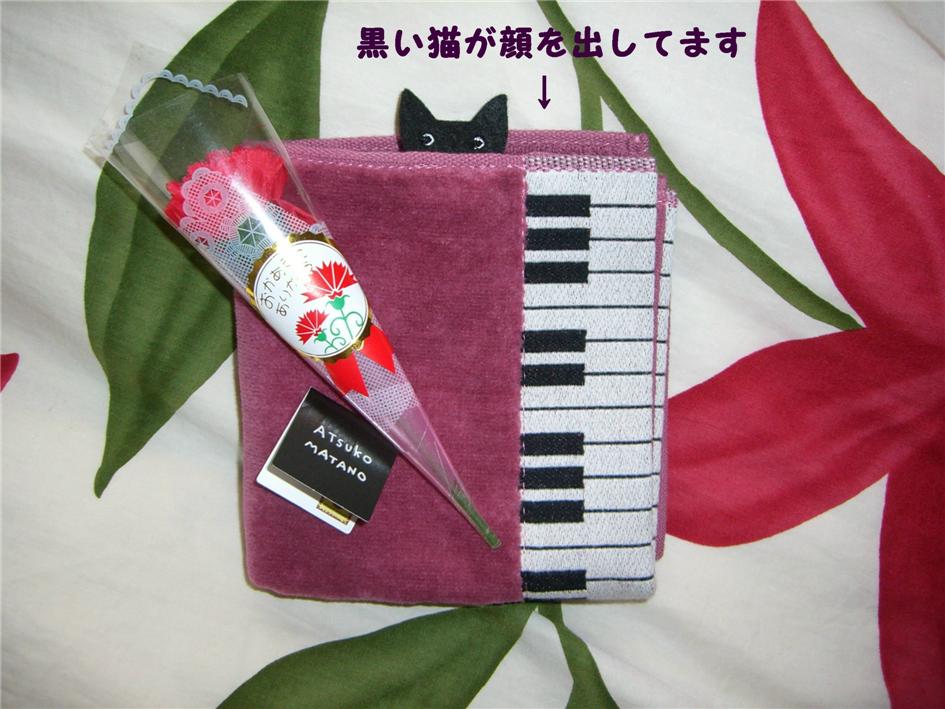 きょうお昼ごろ、何か入った封筒が送られてきました。送り主は、全く知らない会社名物は、茶封筒に入ってます。そっと振ると、「しゃかしゃか、、」という音。「あのさ~これ、、間違ってあけると、返品できなくなって、請求がかかるんじゃない?」「いやあ~~もしかしたら、爆発物なのかも。振ったらまずいよね」「えっ?!爆弾?!警察に届けなきゃならないかな。。」どんどん話が大きくなり、主人も私も、遠巻きで送られてきた物体を眺めています。どうしよう。。。本当に、どうしよう。。。このまま、送り返しちゃおうか、、、、。と私と主人の意見があったのですが、私がちょっと席をはずしているうちに、主人の好奇心は膨れ上がり、そっと、封を開けてみたらしいのです、、、。帰って来た私に、「なんだったと思う??」って。皆さん、、、一体中身はなんだったと思われますか???実は中身、、、「花の種」でした。うちの発注は、あるボランタリーチェーンに対してします。そのボランタリーチェーンが、各卸に注文を振り分ける、と言うシステムになってます。卸が県内の会社ではなく、たくさんあるので、今だに名前を覚える事ができません。結局、そんな卸さんのうちの1軒から、種が送られて来たようです。うちの種は、委託商品。送ってもらった種、こっそり委託商品に忍ばせとかなきゃダメかも、、、です。でも、、爆弾だ~~と大騒動しなくて良かったです(笑)きょう、下の娘が、母の日のプレゼントをくれました。鍵盤にクロネコ。先日東京に行った時、とても欲しかったタオルハンカチです。鍵盤とクロネコが可愛くないですか??うれしかったです♪が、、、自分の両方の母に、まだプレゼントをしていない事を思い出しました。まずい。。。